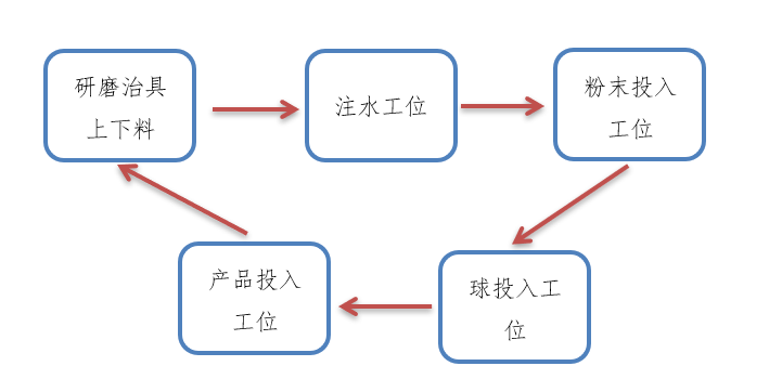倒角工序使用,水粉球自動配料設備是由工作人員將粉末、球、產品倒進對應料箱內,設備自動對水計量和粉末、球、產品稱重,按每種物料的配料比例投入到研磨治具內。